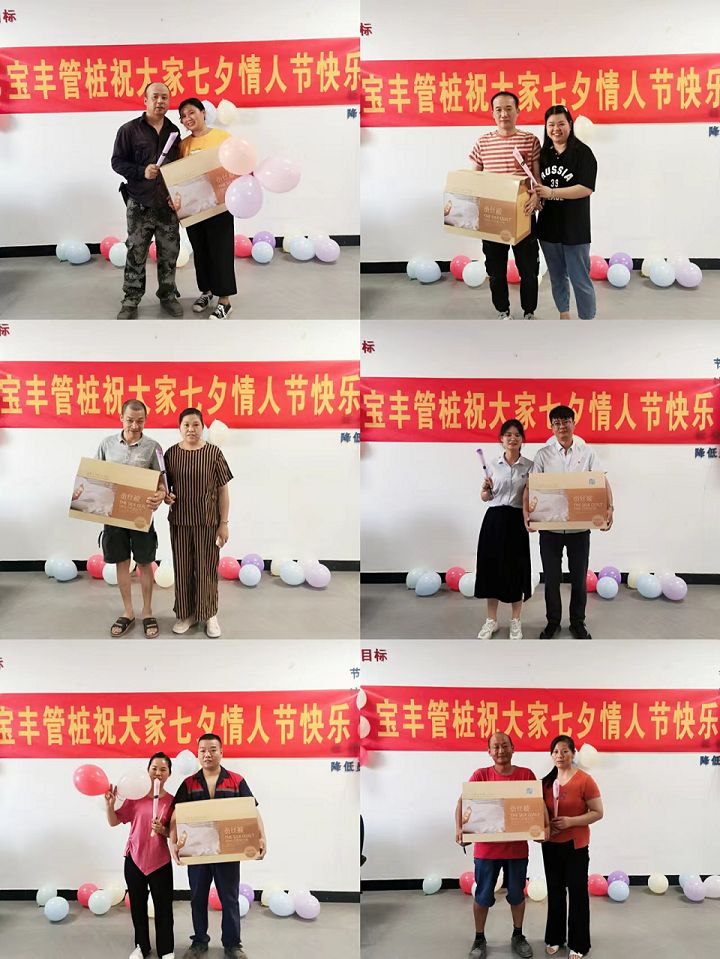 2022年8月4日,福建宝丰管桩有限公司生产部会议室里“鹊桥相会”,50余对恩爱的员工夫妻携手来到活动现场,甜蜜地参与到公司精心为大家准备的七夕节活动。